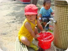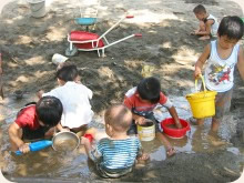 戸外で水、砂、土などの変化する素材に触れ、道具を使い、友だちと遊ぶことで感覚(五感)を育てます。