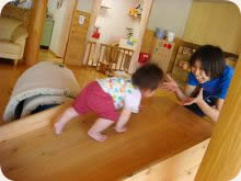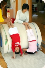 寝返りができる頃からおむつを取り、動きやすくし、広い部屋で腕を床につけ体を支え、這い這いを沢山することで体幹や足指、腰、腕の力をつけます。