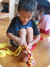 朝、登園すると、必ずマット運動をします。マットの上で背骨の運動や足指を使い、体を回転することで、血の循環をよくし、脳の活性化を図ってから活動に移ります。