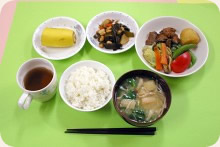 朝のおやつに野菜と牛乳、給食にも野菜を多く使い、栄養バランスに心がけています。また、菜園で無農薬野菜を子どもたちと作っています。