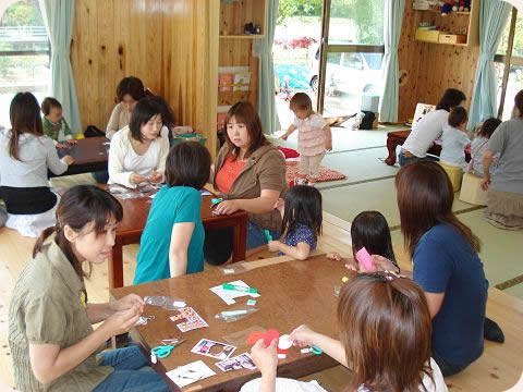 園の向かいに、子育て支援センター「どんぐり」があります。「どんぐり」は、おうちで子育てするお母さん達を応援する施設です。お茶を飲みながらお話したり、遊んだり、色々な行事もあります。また、育児サークル支援、出張支援も行っています。